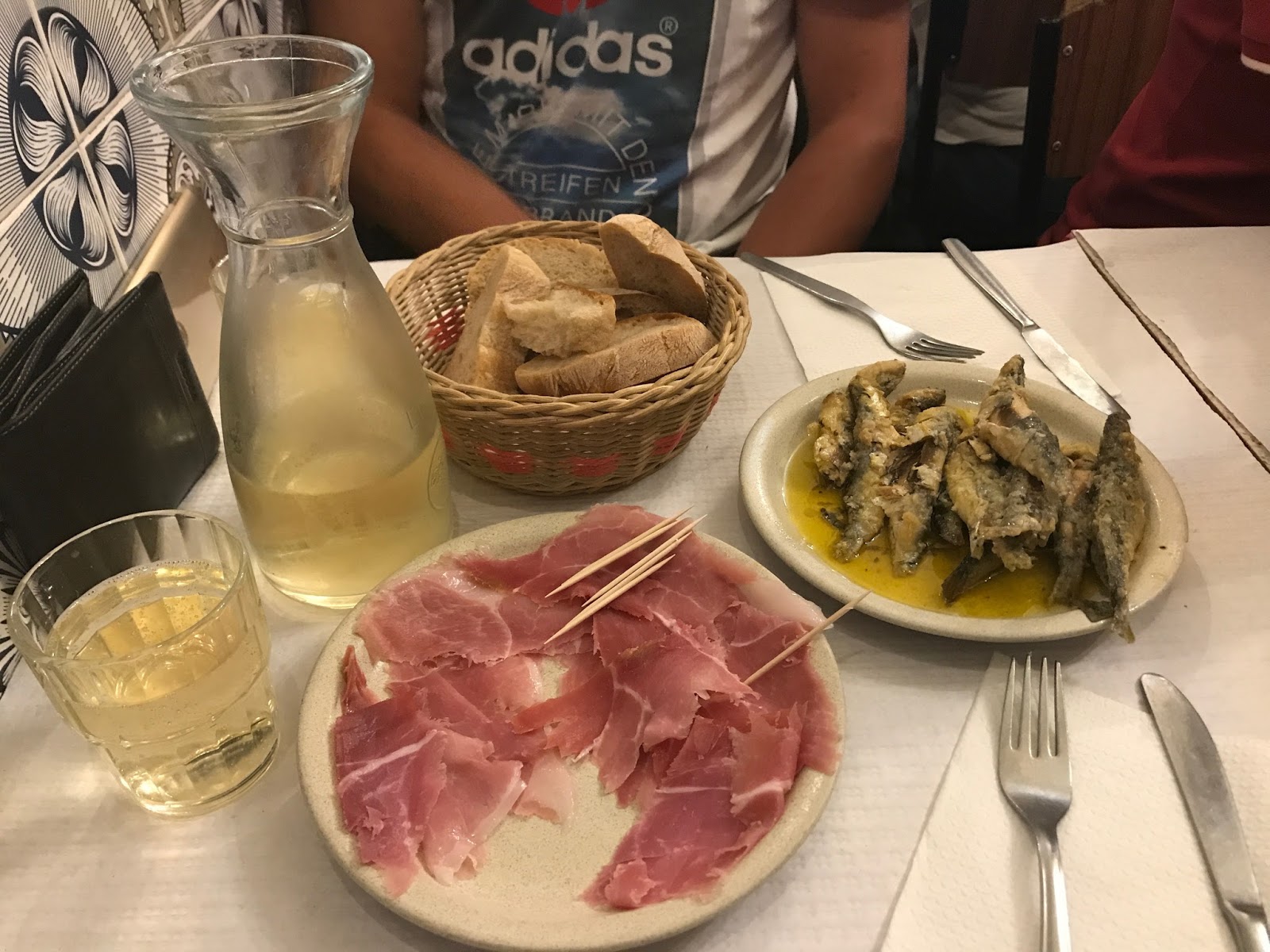 Tapasy (po portugalsku petiscos), szczególnie polecam specjalność właściciela w postaci szprotek na ostro (petingas picantes) i presunto (portugalską szynkę wędzoną).