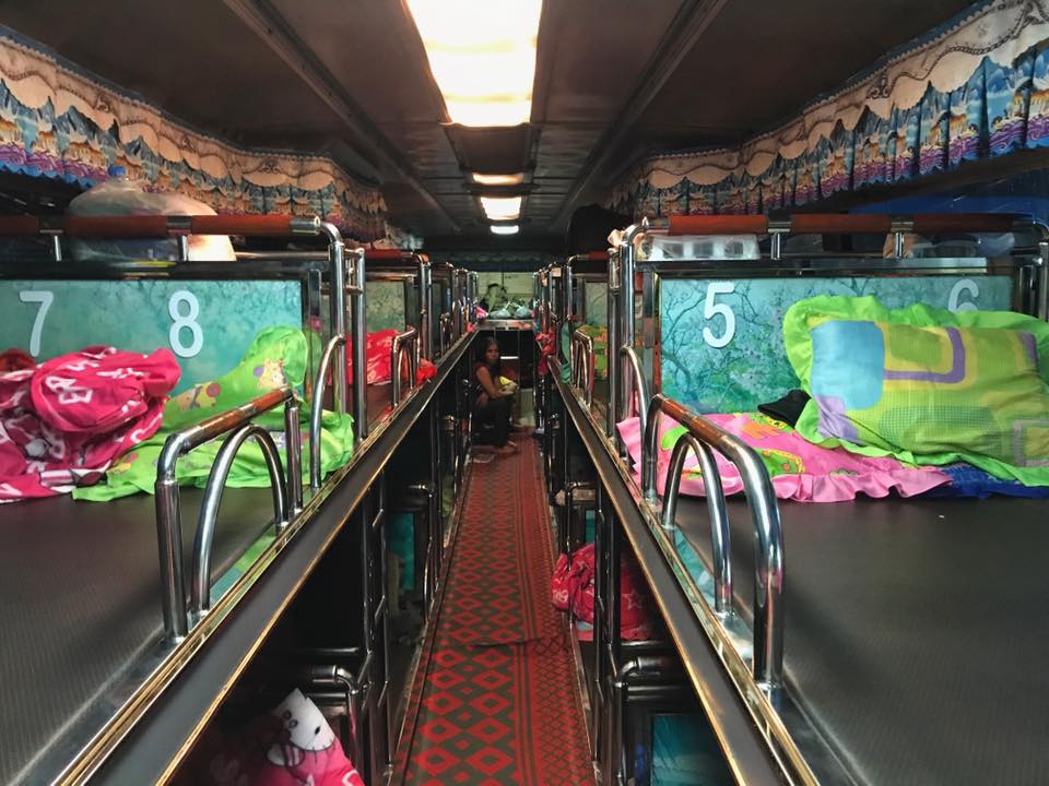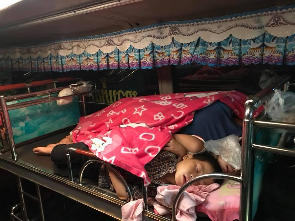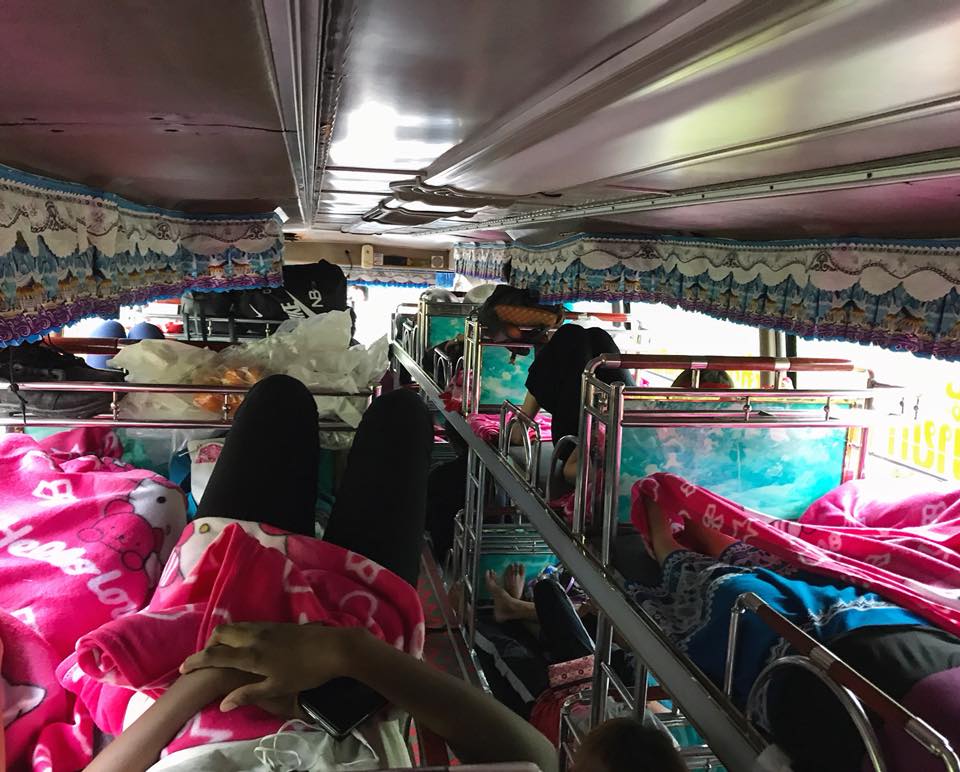 Po wejściu do autobusu dostaliśmy 4 torebki – jedną na buty (w większości krajów Azji południowo – wschodniej jest zakaz wejścia 'na pokład’ w obuwiu), a resztę na różnego rodzaju dolegliwości żołądkowe. W pakiecie był też różowy kocyk i poduszka z Hello Kity. Łóżka były piętrowe. Ilość ich była relatywnie mała, ale mimo to byłyśmy przekonane, że każdej osobie przysługuje jedno, tak jak to miało miejsce w pociągu nocnym z południa na północ Tajlandii. I nagle kierowca łamanym angielskim połączonym z duża ilościa gestykulacji oznajmił nam, że jedno miejsce przeznaczone jest dla minimum dwóch osób. Byłyśmy we trzy. Jedna z nas musiała spać z kimś obcym. Ogarnęło mnie przerażenie. Nie wyobrażałam sobie przez 14h dotykać obcego, spoconego faceta, który nawet nie miał skarpetek na sobie. (A co jakby dotknął mnie swoją stopą????) W końcu Aissa, moja przyjaciółka z Francji, oznajmiła, że przez pierwszą połowę drogi ona będzie dzieliła z kimś łóżko, a potem się zamienimy. Na szczęście, przypadł nam do pary jedyny turysta w autobusie, wcześniej wspomniany student Medycyny. Oznajmiono nam, że jedno łózko jest dla 2 osób. W praktyce spały na nim nawet 4, a kolega, który już wcześniej podróżował tym samym środkim transportu powiedział nam, że w przypadku braku miejsc, ludzie dostają krzesełka i siadają w korytarzu. Miałam duży problem z zaśnięciem, głównie poprzez to, że panowie zdjeli buty, a jestem bardzo wrażliwa na zapachy. Podróżowaliśmy na leżąco bez pasów (bezpieczeństwo ponad wszystko!) I w takich cudownych warunkach upływała mi noc.. Spanie na takiej maleńkiej leżance, pomimo moich 157 cm, do najwygodniejszych nie należy. W końcu udało mi się zasnąć. Uff! Niestety, nie trwało to długo, bo obudził mnie odgłosy wymiotującego dziecka, które wraz z rodziną spało obok mnie. Za chwilę w jego ślady poszła siostra… Byłam już na skraju wytrzymania. Jakaś kobieta płakała. Ptactwo w bagażniku toczyło mini wojnę, koguty piały. I wtedy pierwszy raz w moim życiu pomyślałam – co ja tu właściwie robię? Po co to wszystko? Mam dom, swój pokój, czyste łóżko, a mi się Azji Express zachciało…